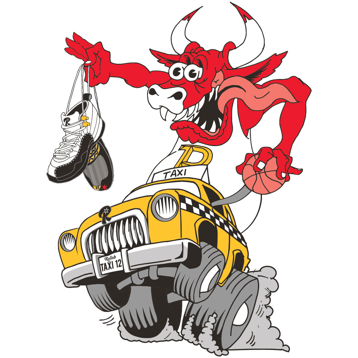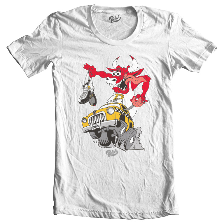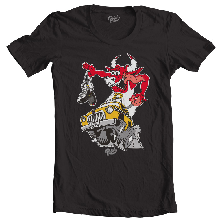 Influenced by the amazing "Rat Fink" hot rod art by Ed Roth, this shirt is designed to match the "Taxi's," Jordan Retro 12 sneakers. This is my first shirt release for Relish.